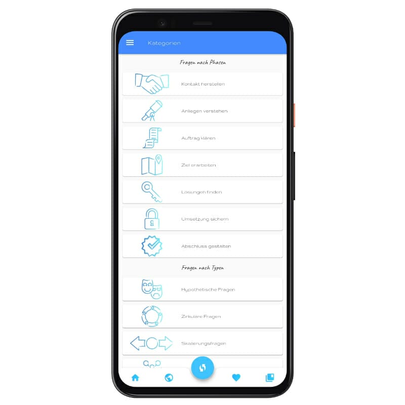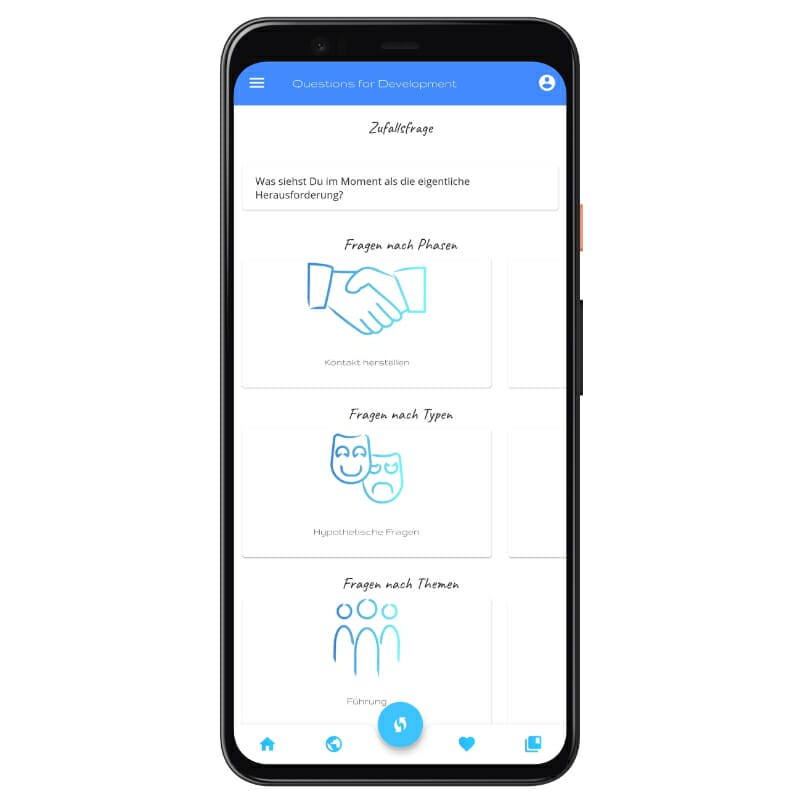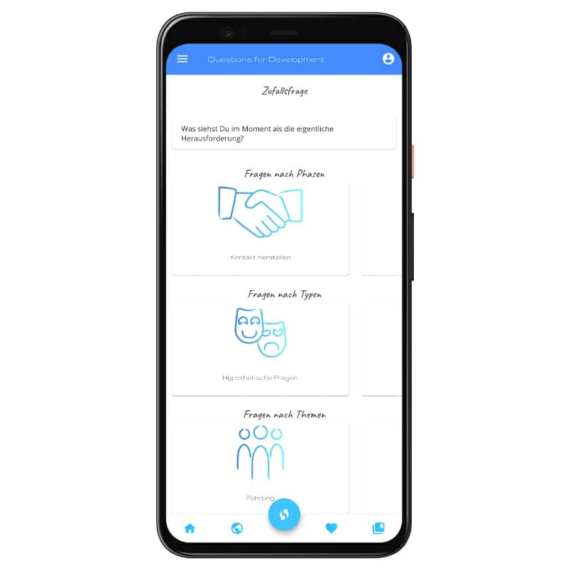 Mit der DEVESTION App gehen Dir nie wieder die Fragen aus. Lass Dich inspirieren, finde die richtige Frage für Deinen aktuellen Coachingprozess, frische Dein Wissen über verschiedene Fragetypen auf oder lasse dich von einer zufälligen CheckIn-Frage überraschen.