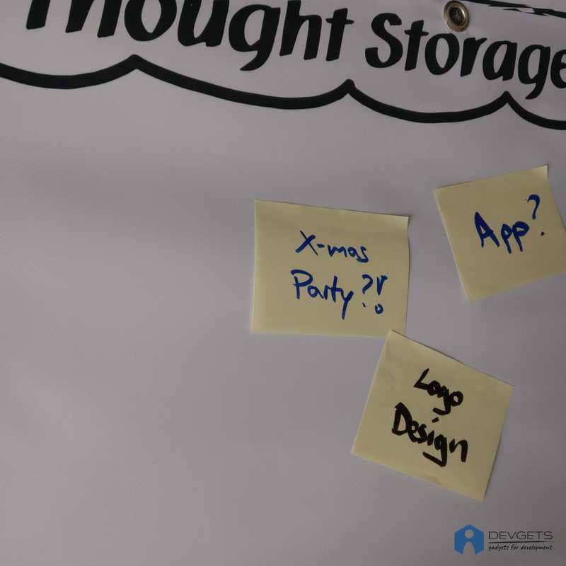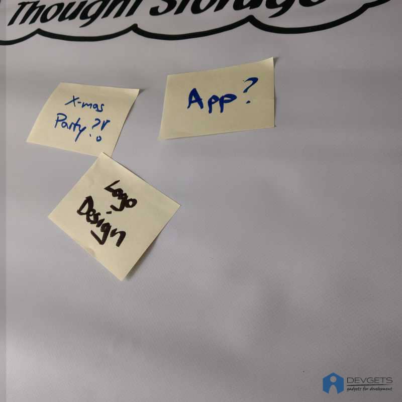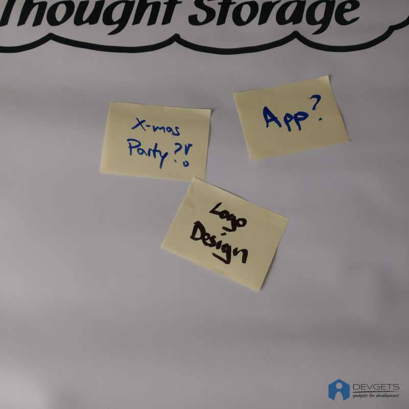 Ob Fragen, offene Themen oder noch zu klärende Prozesspunkte – auf dem Gedankenspeicher ist Platz für alle Gedanken, die präsent bleiben sollten. Im Workshop, Büro oder Besprechungsraum kann der Gedankenspeicher das Bild auflockern und zu einem festen Bestandteil des Workshops oder der täglichen Zusammenarbeit werden.